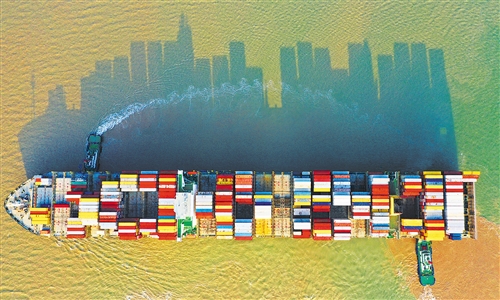 2019年,“中國號”巨輪在高質量航道穩(wěn)健行進,前三季度國內生產總值增長6.2%,在全球經濟總量1萬億美元以上的經濟體中增速最快。圖為一艘滿載集裝箱的貨輪緩緩駛離上海洋山深水港碼頭。計海新攝(中經視覺)