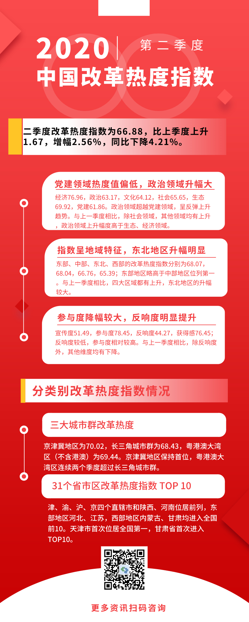 7月21日,中國經(jīng)濟(jì)體制改革研究會(huì)在京發(fā)布《2020年第二季度改革熱度第三方評(píng)估報(bào)告》。報(bào)告顯示,2020年第二季度改革熱度指數(shù)為66.88,比上季度上升1.67,增幅2.56%。