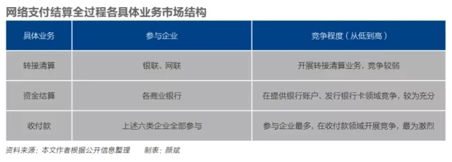 把支付結(jié)算作為一個(gè)完整業(yè)務(wù)來看,各個(gè)環(huán)節(jié)、各企業(yè)交織在一起,競爭力量有較大差距。