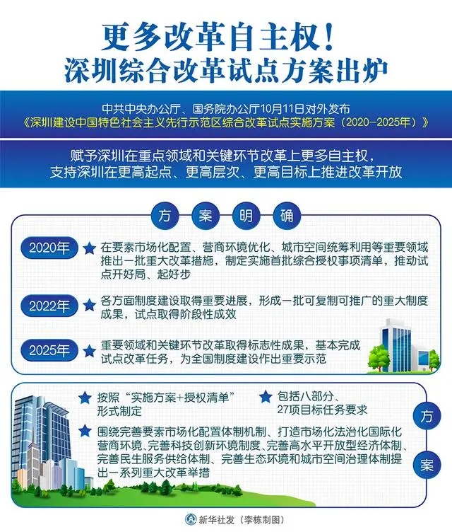 深圳又一次站上新起點(diǎn)。中共中央辦公廳、國(guó)務(wù)院辦公廳近日印發(fā)《深圳建設(shè)中國(guó)特色社會(huì)主義先行示范區(qū)綜合改革試點(diǎn)實(shí)施方案(2020-2025年)》,賦予深圳在重點(diǎn)領(lǐng)域和關(guān)鍵環(huán)節(jié)改革上更多自主權(quán),支持深圳在更高起點(diǎn)、更高層次、更高目標(biāo)上推進(jìn)改革開(kāi)放。