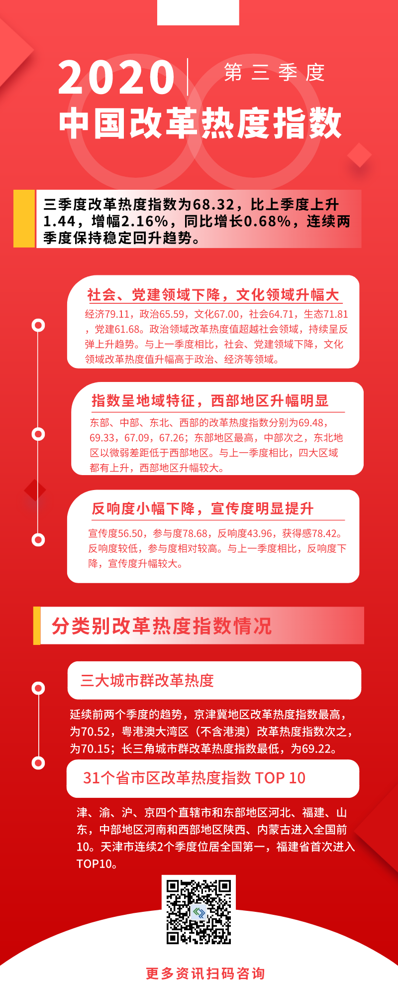 日前,中國(guó)經(jīng)濟(jì)體制改革研究會(huì)發(fā)布2020年第三季度中國(guó)改革熱度第三方評(píng)估報(bào)告。河南省改革熱度指數(shù)位居第六,濮陽(yáng)、開(kāi)封、鄭州、洛陽(yáng)名列前茅。