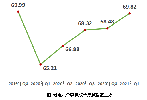 4月21日,中國經(jīng)濟(jì)體制改革研究會在京發(fā)布《2021年第一季度改革熱度第三方評估報(bào)告》。報(bào)告顯示,2021年第一季度改革熱度指數(shù)為69.82,比上一季度增加1.34,連續(xù)4個季度保持穩(wěn)定回升態(tài)勢;比去年同期增加4.61,已經(jīng)基本接近疫情前2019年第4季度69.99的水平。