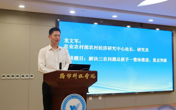 壽光市人大常委會副主任、濰坊科技學院校長李昌武在致辭中表示,濰坊市委副書記、壽光市委書記林紅玉同志在全市三級干部會議上,對我校提出全面提升辦學水平,提高社會服務能力,加快推進碩士點培育建設的要求。為落實林書記講話要求,加強區(qū)域經(jīng)濟和“壽光模式”研究,壽光市人民政府與中國經(jīng)濟體制改革研究會等聯(lián)合成立的“新時代鄉(xiāng)村振興與區(qū)域經(jīng)濟發(fā)展研究院”掛靠學院,引進了大批高層次人才,形成了一批富有創(chuàng)造性、建設性的學術研究成果和決策咨詢意見,“壽光模式”研究成果在國家發(fā)改委《改革內(nèi)參》刊發(fā)。成立了國家二級學會農(nóng)學思想與《齊民要術》研究會,連續(xù)成功舉辦了10屆中華農(nóng)圣文化國際研討會,師生原創(chuàng)52集動畫片《農(nóng)圣賈思勰》在中央電視臺和山東衛(wèi)視播出。學校組建了博士、教授農(nóng)學科研服務團隊,成立了蔬菜產(chǎn)業(yè)學院、農(nóng)業(yè)技術培訓基地,自主研發(fā)蔬菜品種28個,在全國7個省區(qū)建立了育種基地,開發(fā)運營了壽光市農(nóng)業(yè)智慧監(jiān)管服務公共平臺,打造了覆蓋設施農(nóng)業(yè)全產(chǎn)業(yè)鏈的專業(yè)服務體系,為創(chuàng)新提升“壽光模式”和鄉(xiāng)村振興戰(zhàn)略的實施提供了有力支撐。