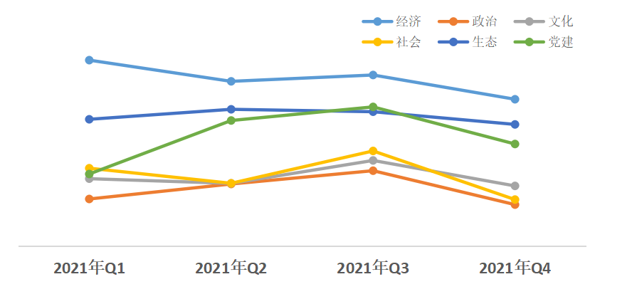 從近幾個季度的評估結果來看,除經濟、生態(tài)領域,其他領域熱度值均在第三季度達到2021年度熱度指數峰值,但隨后呈下降趨勢。經濟領域熱度值領先其他領域,政治領域改革熱度值偏低;社會、政治、黨建領域降幅較大。