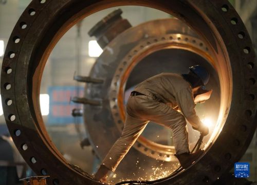4月14日,在哈電集團(tuán)哈爾濱鍋爐廠有限責(zé)任公司車間,工人進(jìn)行生產(chǎn)作業(yè)。新華社記者 王建威 攝