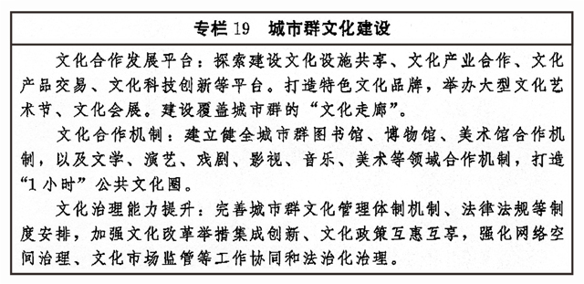 加強區(qū)域文化協(xié)同創(chuàng)新,健全合作互助、扶持補償機制,推動?xùn)|部地區(qū)以創(chuàng)新引領(lǐng)文化發(fā)展,加大力度支持中西部地區(qū)以及東北等老工業(yè)基地文化發(fā)展,扶持革命老區(qū)、民族地區(qū)、邊疆地區(qū)文化發(fā)展,形成相互促進、優(yōu)勢互補、融合互動的區(qū)域文化發(fā)展格局。圍繞京津冀協(xié)同發(fā)展、長江經(jīng)濟帶發(fā)展、粵港澳大灣區(qū)建設(shè)、長三角一體化發(fā)展、黃河流域生態(tài)保護和高質(zhì)量發(fā)展等區(qū)域重大戰(zhàn)略,健全推進區(qū)域內(nèi)文化協(xié)同發(fā)展機制,提升公共文化設(shè)施互聯(lián)互通水平,加強區(qū)域文化產(chǎn)業(yè)帶建設(shè),實現(xiàn)區(qū)域文化建設(shè)水平整體提高。促進形成文化產(chǎn)業(yè)發(fā)展新格局,創(chuàng)新城市群文化一體化發(fā)展體制機制,共建高水平合作平臺,加強公共文化服務(wù)便利共享。完善以城帶鄉(xiāng)、城鄉(xiāng)融合的文化發(fā)展體制機制,發(fā)揮城市帶動輻射作用,加快城鄉(xiāng)間文化要素雙向流動,形成以點帶面、特色鮮明、優(yōu)勢互補、均衡配置的城鄉(xiāng)文化發(fā)展新格局。