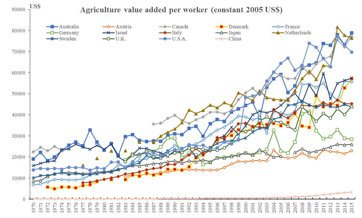 如圖5,西方城市化過(guò)程中兩個(gè)收入差距的縮小在中國(guó)沒(méi)有出現(xiàn)。中國(guó)在最快速城市化階段出現(xiàn)了城鄉(xiāng)收入差距拉大,第一是我們只有快速城市化,但沒(méi)有城鄉(xiāng)融合。第二是我們城市化的模式是回村的城市化模式。在城市里干工作,干到一定程度再回到農(nóng)村,這是全世界沒(méi)有的。第三是農(nóng)業(yè)競(jìng)爭(zhēng)力下降。現(xiàn)在一定要有一個(gè)認(rèn)識(shí),農(nóng)業(yè)的份額降到10%以后,各個(gè)國(guó)家的農(nóng)業(yè)到底在干什么?我們現(xiàn)在想到農(nóng)業(yè)到10%,再到2%、1%,農(nóng)業(yè)就可有可無(wú)了,這種觀點(diǎn)是錯(cuò)誤的。所有國(guó)家的農(nóng)業(yè)在降到10%以后,農(nóng)業(yè)在變強(qiáng),它的農(nóng)業(yè)和原來(lái)的農(nóng)業(yè)完全不一樣。中國(guó)由于單向城市化的模式,最后農(nóng)業(yè)競(jìng)爭(zhēng)力進(jìn)一步下降。(如圖6)我們現(xiàn)在只有6%、7%的農(nóng)業(yè),這個(gè)農(nóng)業(yè)的競(jìng)爭(zhēng)力是下降的,背后是農(nóng)業(yè)成本上升,所有成本都在上升。