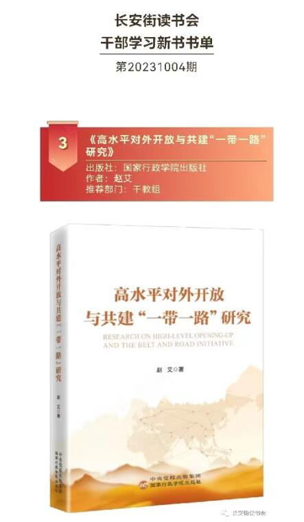 2023年10月18日,在第三屆“一帶一路”國(guó)際合作高峰論壇在北京隆重舉辦之際,長(zhǎng)安街讀書(shū)會(huì)發(fā)布第20231004期干部學(xué)習(xí)新書(shū)書(shū)單,我會(huì)常務(wù)副會(huì)長(zhǎng)兼秘書(shū)長(zhǎng)趙艾新著《高水平對(duì)外開(kāi)放與共建“一帶一路”研究》名列推薦榜單。