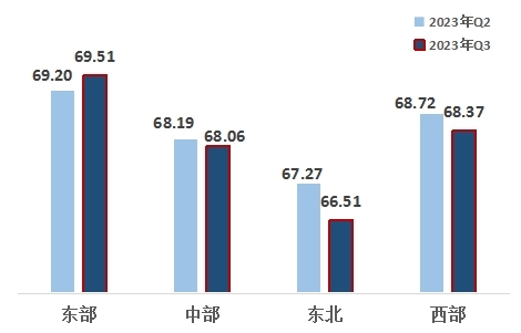 東部、西部、中部、東北地區(qū)指數(shù)分別為69.51、68.37、68.06、66.51。區(qū)域改革熱度指數(shù)呈適當(dāng)?shù)牡赜蛱卣?,東部地區(qū)領(lǐng)先,西部地區(qū)排名第二,且連續(xù)六個季度超越中部地區(qū),東北地區(qū)最后。與上一季度相比,東部地區(qū)改革熱度指數(shù)有所上升。