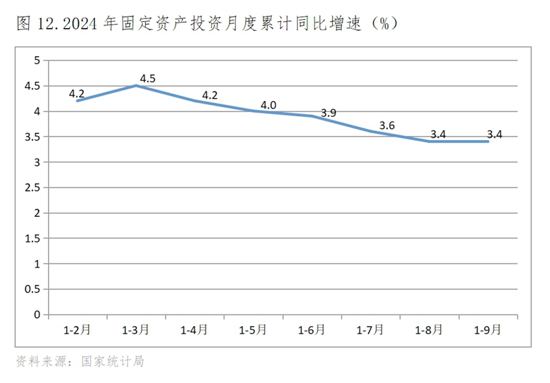 (二)投資增速持續(xù)回落更為明顯,9月份保持穩(wěn)定。1-2月份固定資產(chǎn)投資同比增長(zhǎng)4.2%,1-3月份增速回升到今年以來的最高增速的4.5%,自此以后持續(xù)回落,到8月份回落到3.4%,9月份保持穩(wěn)定,與8月份增速持平。