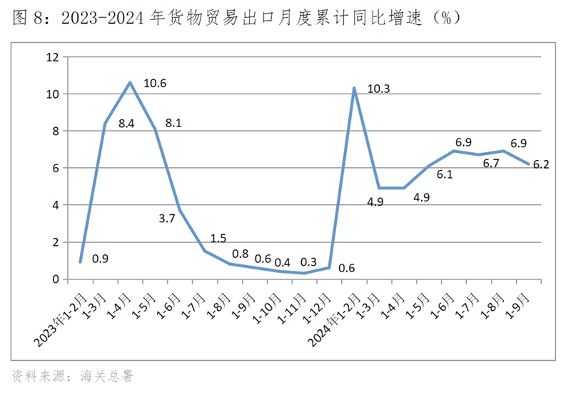 隨著一系列宏觀調(diào)控政策的貫徹落實(shí),包括新增地方政府專項(xiàng)債券、增發(fā)超長(zhǎng)期特別國(guó)債、大規(guī)模的設(shè)備更新、消費(fèi)品的以舊換新、繼續(xù)減稅降費(fèi)、降準(zhǔn)降息、放寬住房購(gòu)買限制等政策措施,與上年同期對(duì)比,今年以來工業(yè)、投資和出口增速回升,零售和財(cái)政支出增速回落。