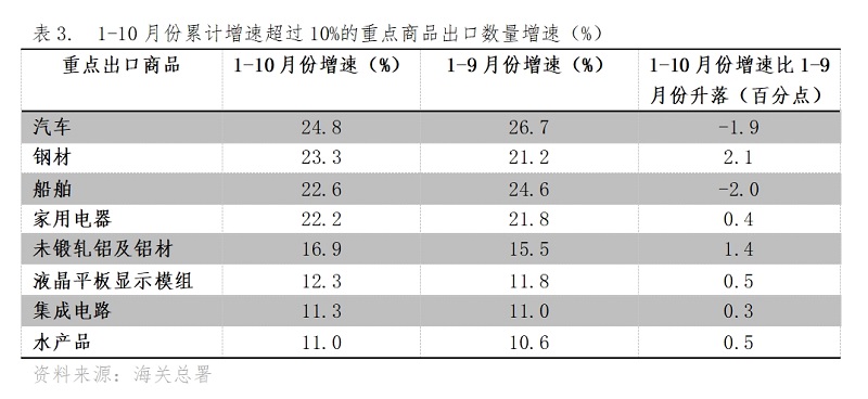 1-10月份,累計(jì)出口數(shù)量增長(zhǎng)速度超過(guò)10%的重點(diǎn)商品共有8類,與1-9月份持平,其中6類增速回升,2類增速回落,即汽車出口增長(zhǎng)24.8%,鋼材出口增長(zhǎng)23.3%,船舶出口增長(zhǎng)22.6%,家用電器出口增長(zhǎng)22.2%,未鍛軋鋁及鋁材出口增長(zhǎng)16.9%,液晶平板顯示模組出口增長(zhǎng)12.3%,集成電路出口增長(zhǎng)11.3%,水產(chǎn)品出口增長(zhǎng)11.0%。