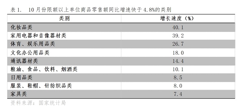 10月份,限額以上單位商品零售額增速快于社會(huì)消費(fèi)品零售總額4.8%增速的共有9類,即化妝品類同比增長(zhǎng)40.1%,家用電器和音像器材類增長(zhǎng)39.2%,體育、娛樂(lè)用品類增長(zhǎng)26.7%,文化辦公用品類增長(zhǎng)18.0%,通訊器材類增長(zhǎng)14.4%,糧油、食品、飲料、煙酒類增長(zhǎng)10.1%,日用品類增長(zhǎng)8.5%,服裝、鞋帽、針紡織品類增長(zhǎng)8.0%,家具類增長(zhǎng)7.4%。