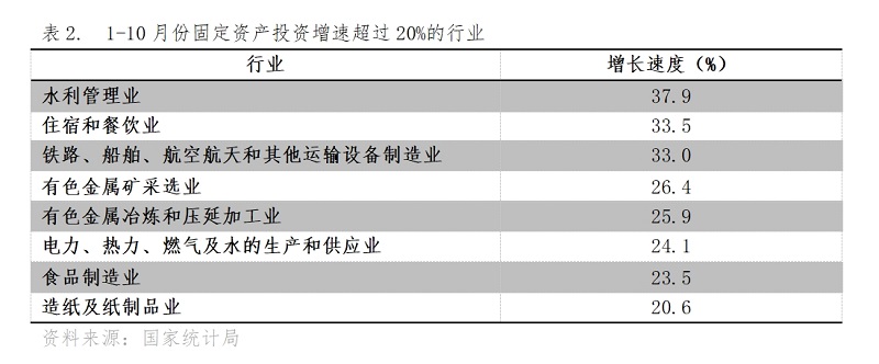 1-10月份,固定資產(chǎn)投資增速超過(guò)20%的行業(yè)共8個(gè),即水利管理業(yè)增長(zhǎng)37.9%,住宿和餐飲業(yè)增長(zhǎng)33.5%,鐵路、船舶、航空航天和其他運(yùn)輸設(shè)備制造業(yè)增長(zhǎng)33.0%,有色金屬礦采選業(yè)增長(zhǎng)26.4%,有色金屬冶煉和壓延加工業(yè)增長(zhǎng)25.9%,電力、熱力、燃?xì)饧八纳a(chǎn)和供應(yīng)業(yè)增長(zhǎng)24.1%,食品制造業(yè)增長(zhǎng)23.5%,造紙及紙制品業(yè)增長(zhǎng)20.6%。