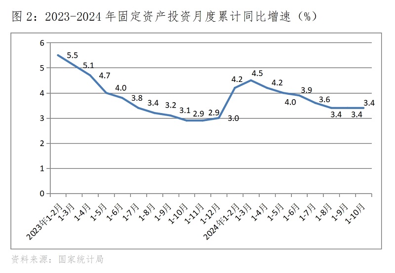 (二)投資增速持續(xù)持平。1-10月份,固定資產(chǎn)投資同比增長(zhǎng)3.4%,與1-9月份增長(zhǎng)3.4%持平,1-8月份也是增長(zhǎng)3.4%,投資增速扭轉(zhuǎn)了此前連續(xù)5個(gè)月的回落,保持了連續(xù)3個(gè)月的持平。國(guó)有控股投資增速略有回升,1-10月份比1-9月份回升0.1個(gè)百分點(diǎn);民間投資降幅略有擴(kuò)大,1-10月份比1-9月份擴(kuò)大0.1個(gè)百分點(diǎn)。三次產(chǎn)業(yè)投資中,第一產(chǎn)業(yè)投資增速回升0.2個(gè)百分點(diǎn),第二產(chǎn)業(yè)投資增速回落0.1個(gè)百分點(diǎn),第三產(chǎn)業(yè)投資降幅擴(kuò)大0.2個(gè)百分點(diǎn)。