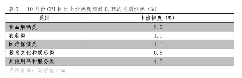 漲幅超過(guò)CPI同比上漲0.3%的類別共有5類,即食品煙酒類價(jià)格同比上漲2.0%,衣著類上漲1.1%,醫(yī)療保健類上漲1.1%,教育文化和娛樂(lè)類上漲0.8%,其他用品和服務(wù)類上漲4.7%。