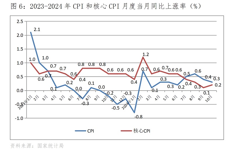 (二) CPI漲幅繼續(xù)回落。10月份,CPI同比上漲0.3%,比9月份上漲0.4%回落了0.1個(gè)百分點(diǎn),而9月份比8月份回落0.2個(gè)百分點(diǎn),延續(xù)了上月回落的態(tài)勢(shì)。其中食品價(jià)格上漲2.9%,比上月上漲3.3%回落0.4個(gè)百分點(diǎn);非食品價(jià)格下降0.3%,比上月下降0.2%擴(kuò)大0.1百分點(diǎn)。10月份,核心CPI同比上漲0.2%,比9月份上漲0.1%回升了0.1個(gè)百分點(diǎn)。CPI和核心CPI漲幅,雖然比上月一落一升,但由于漲幅都仍還比較低,說(shuō)明市場(chǎng)需求仍還較為疲弱。