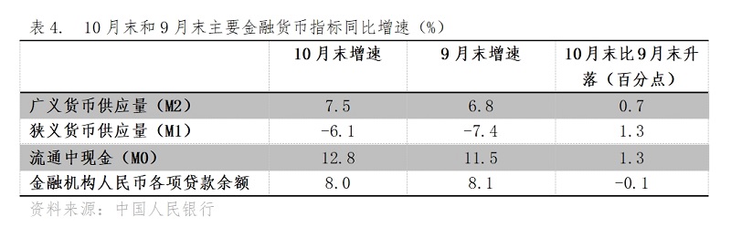 (四)M2增速持續(xù)回升。10月末,廣義貨幣供應(yīng)量(M2)同比增長(zhǎng)7.5%,比9月末增長(zhǎng)6.8%回升0.7個(gè)百分點(diǎn),9月末增速比8月末增速回升了0.5個(gè)百分點(diǎn);狹義貨幣供應(yīng)量(M1)降幅由擴(kuò)大轉(zhuǎn)為縮小,10月末同比下降6.1%,比9月末下降7.4%縮小1.3個(gè)百分點(diǎn),而9月末降幅比8月末降幅擴(kuò)大0.1個(gè)百分點(diǎn),扭轉(zhuǎn)了自5月末以來(lái)降幅逐月擴(kuò)大的趨勢(shì);流通中貨幣(M0)增速由落轉(zhuǎn)升,10月末同比增長(zhǎng)12.8%,比9月末增長(zhǎng)11.5%回升了1.3個(gè)百分點(diǎn),而9月末增速比8月末增速回落了0.7個(gè)百分點(diǎn)。貨幣供應(yīng)量增速的回升或降幅的縮小,對(duì)經(jīng)濟(jì)回升將發(fā)揮著積極的重要作用。
