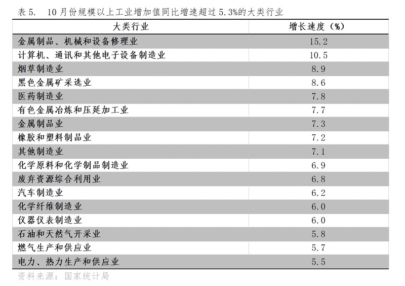 10月份,增長(zhǎng)速度超過(guò)規(guī)模以上工業(yè)增長(zhǎng)5.3%的主要大類行業(yè)共有17個(gè),即金屬制品、機(jī)械和設(shè)備修理業(yè)同比增長(zhǎng)15.2%,計(jì)算機(jī)、通訊和其他電子設(shè)備制造業(yè)增長(zhǎng)10.5%,煙草制造業(yè)增長(zhǎng)8.9%,黑色金屬礦采選業(yè)增長(zhǎng)8.6%,醫(yī)藥制造業(yè)增長(zhǎng)7.8%,有色金屬冶煉和壓延加工業(yè)增長(zhǎng)7.7%,金屬制品業(yè)增長(zhǎng)7.3%,橡膠和塑料制品業(yè)增長(zhǎng)7.2%,其他制造業(yè)增長(zhǎng)7.1%,化學(xué)原料和化學(xué)制品制造業(yè)增長(zhǎng)6.9%,廢棄資源綜合利用業(yè)增長(zhǎng)6.8%,汽車制造業(yè)增長(zhǎng)6.2%,化學(xué)纖維制造業(yè)增長(zhǎng)6.0%,儀器儀表制造業(yè)增長(zhǎng)6.0%,石油和天然氣開(kāi)采業(yè)增長(zhǎng)5.8%,燃?xì)馍a(chǎn)和供應(yīng)業(yè)增長(zhǎng)5.7%,電力、熱力生產(chǎn)和供應(yīng)業(yè)增長(zhǎng)5.5%。