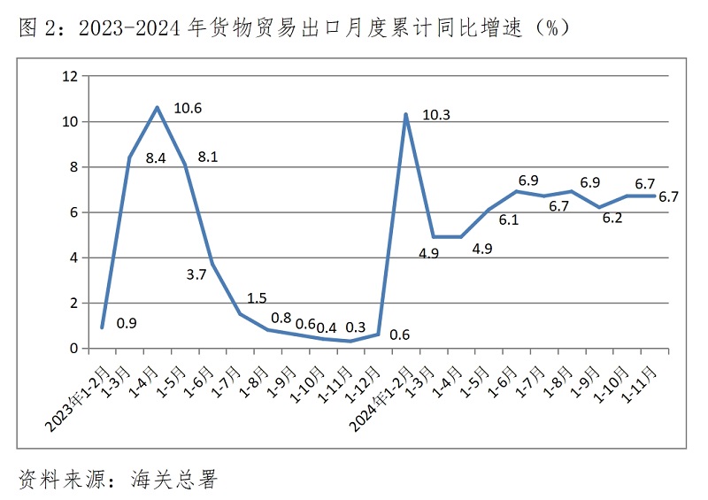 (二)貨物出口增速由升轉(zhuǎn)平。1-11月份,貨物出口同比增長(zhǎng)6.7%,與1-10月份增速持平,1-10月份增速比1-9月份增速6.2%回升0.5個(gè)百分點(diǎn)。對(duì)歐盟、美國(guó)和東盟等貨物出口增速全面回升,1-11月份對(duì)歐盟出口增長(zhǎng)3.8%,比1-10月份回升0.3個(gè)百分點(diǎn);對(duì)美國(guó)出口增長(zhǎng)5.1%,比1-10月份回升0.2個(gè)百分點(diǎn);對(duì)東盟出口增長(zhǎng)12.7%,比1-10月份回升0.2個(gè)百分點(diǎn);但對(duì)拉丁美洲出口增長(zhǎng)14.1%,比1-10月份回落0.4個(gè)百分點(diǎn)。