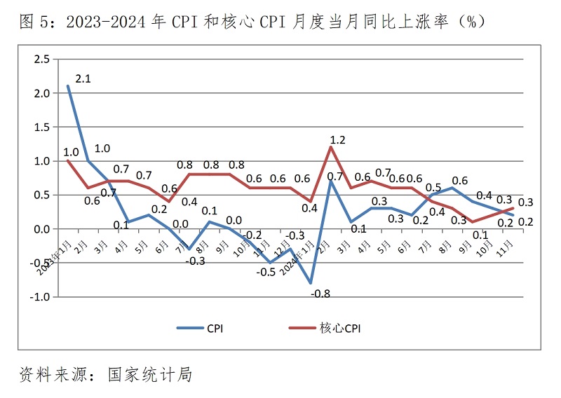 (三) CPI漲幅繼續(xù)小幅回落。11月份,CPI同比上漲0.2%,比10月份上漲0.3%回落了0.1個(gè)百分點(diǎn),而10月份漲幅比9月份漲幅回落0.1個(gè)百分點(diǎn),延續(xù)了上月漲幅回落的態(tài)勢(shì)。其中食品價(jià)格上漲1.0%,比上月上漲2.9%回落1.9個(gè)百分點(diǎn);非食品價(jià)格持平,上月為下降0.3%。11月份,核心CPI同比上漲0.3%,比10月份上漲0.2%回升了0.1個(gè)百分點(diǎn)。CPI和核心CPI漲幅都仍還比較低,說明市場(chǎng)需求仍還較為疲弱。