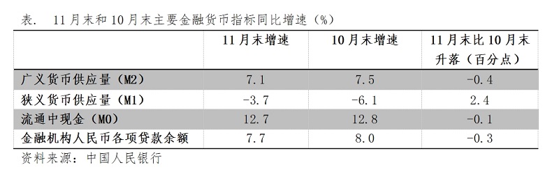 (四)M2增速由升轉(zhuǎn)落。11月末,廣義貨幣供應(yīng)量(M2)同比增長(zhǎng)7.1%,比10月末增長(zhǎng)7.5%回落0.4個(gè)百分點(diǎn),10月末增速比9月末增速回升0.7個(gè)百分點(diǎn);狹義貨幣供應(yīng)量(M1)降幅繼續(xù)縮小,11月末同比下降3.7%,比10月末同比下降6.1%縮小2.4個(gè)百分點(diǎn),10月末降幅比9月末降幅縮小1.3個(gè)百分點(diǎn);流通中貨幣(M0)增速由升轉(zhuǎn)落,11月末同比增長(zhǎng)12.7%,比10月末增長(zhǎng)12.8%回落0.1介百分點(diǎn),10月末增速比9月末增速回升了1.3個(gè)百分點(diǎn)。各層次貨幣供應(yīng)量又出現(xiàn)了不同方向的變化走勢(shì)。