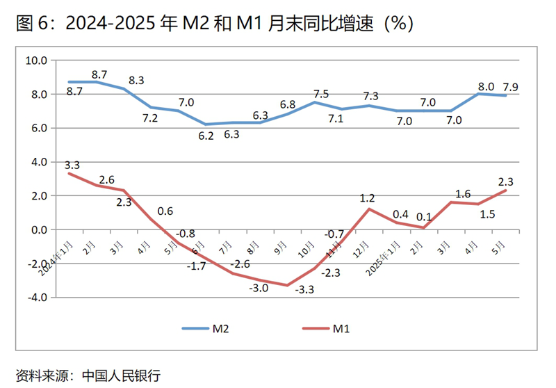 (六)M2增速由升轉(zhuǎn)落。5月末,廣義貨幣供應量(M2)同比增長7.9%,比4月末增長8.0%回落0.1個百分點,基本保持了上月末的增速;狹義貨幣供應量(M1)增速比上月有所回升,5月末同比增長2.3%,比4月末增長1.5%回升0.8個百分點,而4月末增幅比3月末增幅回落0.1個百分點;流通中貨幣(M0)增速持續(xù)回升,5月末同比增長12.1%,比4月末增長12.0%回升0.1個百分點,而4月末增速比3月末增速回升0.5個百分點。5月末M2增速與上月增速基本持平,M1和M0增速回升,表明貨幣政策仍在向適度寬松方向的要求運行,但需要關(guān)注的還是M1增速仍還比較緩慢。