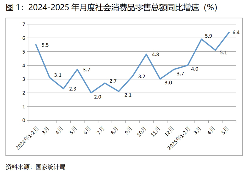 (一)零售增速由落轉(zhuǎn)升。5月份,社會消費品零售總額同比增長6.4%,比4月份增長5.1%回升了1.3個百分點,4月份比3月份增長5.8%回落了0.7個百分點,社會消費品零售總額增速由上月回落轉(zhuǎn)為回升,為上年以來月度同比增速最快的月份。這是近一個時期特別是今年以來持續(xù)采取以舊換新等一系列擴大消費政策措施的結(jié)果,同時也說明只要采取積極有效的政策措施,是能夠取得一些領域持續(xù)回升的效果。