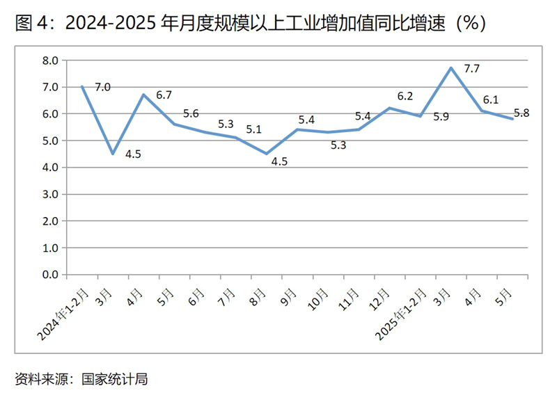 (四)工業(yè)增速持續(xù)回落。5月份,規(guī)模以上工業(yè)增加值同比增長5.8%,比上月增長6.1%回落了0.3個百分點,4月份比3月份回落了1.6個百分點,呈現(xiàn)出兩個月的連續(xù)回落。從工業(yè)三大門類看,主要是制造業(yè)增速回落。5月份采礦業(yè)同比增長5.7%,與上月持平;制造業(yè)增長6.2%,比上月回落0.4個百分點;電力、熱力、燃氣及水生產(chǎn)和供應業(yè)增長2.2%,比上月回升0.1個百分點。5月份工業(yè)增速回落幅度雖然比上月收窄不少,但還是要密切關(guān)注回落背后反映出的工業(yè)增長動力未來可能變動的趨勢。