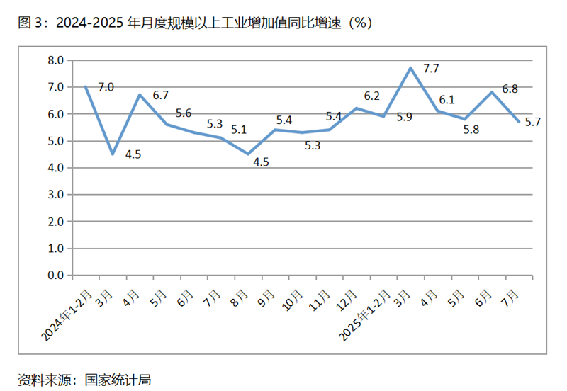 (一)工業(yè)增速由升轉(zhuǎn)落。7月份,規(guī)模以上工業(yè)增加值同比增長5.7%,比上月增長6.8%回落了1.1個百分點,6月份比5月份回升了1.0個百分點。從工業(yè)三大門類看,采礦業(yè)和制造業(yè)增速比上月回落,電力、熱力、燃氣及水生產(chǎn)和供應(yīng)業(yè)增速回升,7月份采礦業(yè)同比增長5.0%,比上月回落1.1個百分點;制造業(yè)增長6.2%,比上月回落1.2個百分點;電力、熱力、燃氣及水生產(chǎn)和供應(yīng)業(yè)增長3.3%,比上月回升1.5個百分點。今年以來工業(yè)增速波動的運行,反映出工業(yè)的回升仍缺乏穩(wěn)固的基礎(chǔ)。