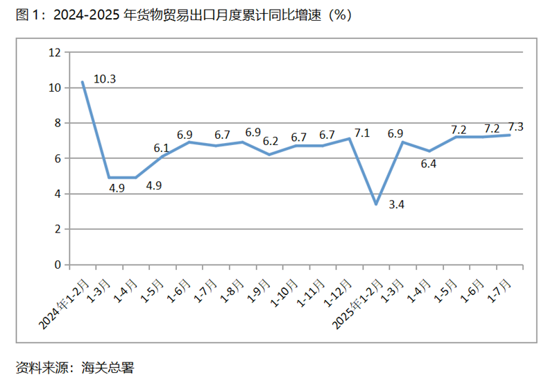 (一)貨物出口增速由平轉(zhuǎn)升。1-7月份,貨物出口同比增長7.3%,比1-6月份增長7.2%回升0.1個百分點,1-6月份與1-5月份持平,增速呈現(xiàn)出由平轉(zhuǎn)升的態(tài)勢。貨物出口對主要貿(mào)易出口經(jīng)濟體增速有升有平也有落,1-7月份對歐盟出口同比增長8.2%,比1-6月份7.9%增速回升0.3個百分點;對美國出口下降11.6%,比1-6月份下降9.9%擴大1.7個百分點;對東盟出口增長14.8%,比1-6月份14.3%增速回升0.5個百分點;對拉丁美洲出口增長8.4%,與1-6月份8.4%增速持平;對非洲出口增長25.9%,比1-6月份23.0%增速回升2.9個百分點。面對較為復(fù)雜嚴峻的國際形勢,出口增速由平轉(zhuǎn)升,充分說明我國出口有著較強的韌性。