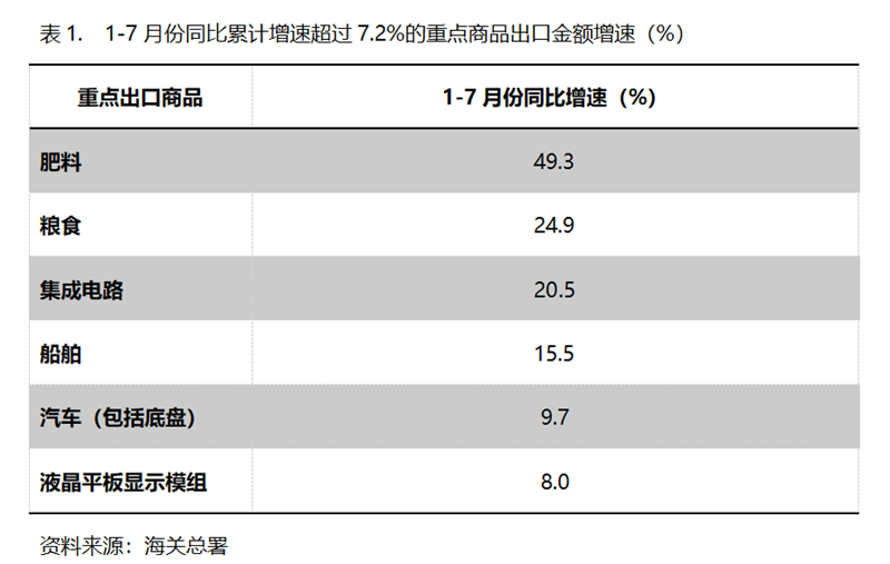 1-7月份,出口金額同比增速超過7.3%的重點商品共有6類,即肥料出口增長49.3%,糧食增長24.9%,集成電路增長20.5%,船舶增長15.5%,汽車(包括底盤)增長9.7%,液晶平板顯示模組增長8.0%。