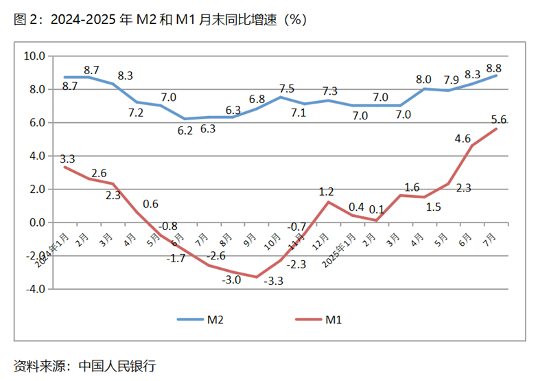(二)M2增速持續(xù)回升。7月末,廣義貨幣供應(yīng)量(M2)同比增長8.8%,比6月末增長8.3%回升0.5個百分點,6月末增速比5月末7.9%的增速回升了0.4個百分點,保持了持續(xù)回升勢頭;狹義貨幣供應(yīng)量(M1)同比增長5.6%,比6月末增長4.6%回升1.0個百分點,6月末增幅比5月末2.3%增幅回升2.3個百分點;流通中貨幣(M0)增速持續(xù)小幅回落,7月末同比增長11.8%,比6月末增長12.0%回落0.2個百分點,而6月末增速比5月末增速回落0.1個百分點。7月末M2和M1增速的持續(xù)回升,M0增速的基本持平,表明貨幣政策仍在向適度寬松方向的要求運行, M1緩慢的增長仍需要給予高度關(guān)注。