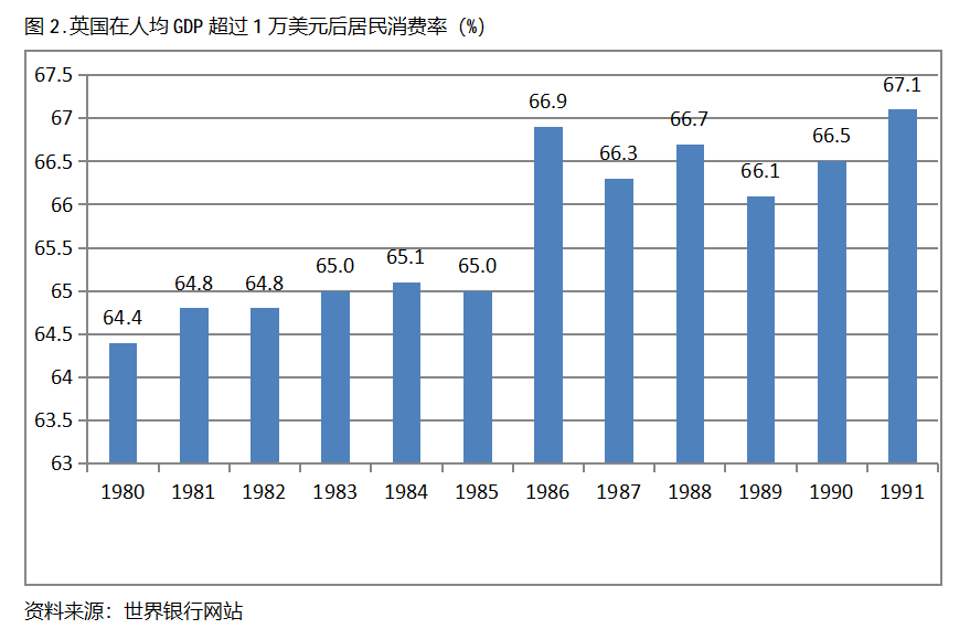 英國在人均GDP超過1萬美元后的12年期間,居民消費(fèi)率一直保持在64.0%以上,同時(shí)也呈現(xiàn)出總體持續(xù)提高的趨勢(shì)。英國在1980年人均GDP超過1萬美元,當(dāng)年居民消費(fèi)率為64.4%,此后總體保持了持續(xù)提高的態(tài)勢(shì),12年后的1991年提高到67.1%,提高了2.7個(gè)百分點(diǎn)。