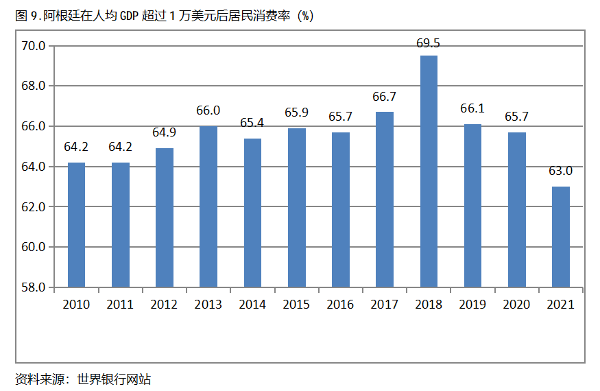 阿根廷在人均GDP超過1萬美元后的12年期間,居民消費(fèi)率基本上保持在63.0%以上,也呈現(xiàn)出較長時(shí)間的提高,但后幾年也出現(xiàn)小幅的回落。阿根廷在2010年人均GDP超過1萬美元,當(dāng)年居民消費(fèi)率為64.2%,2018提高到69.5%,隨后兩年出現(xiàn)回落,2021年為63.0%,也就是說,阿根廷在人均GDP超過1萬美元后的12年期間,居民消費(fèi)率由當(dāng)年的64.2%提高到2018年最高的69.5%,共提高了5.3個(gè)百分點(diǎn)。